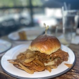 Great food and service! (For what I had) Nice spacious and warm dining area. Our server was nice and prompt with checking in on us and what we needed. However, the star of the show was probably the juiciest fried chicken sandwich I've ever had at a brunch place. The sandwich was great size and beautifully assembled and accompanied with thin, well seasoned fries. We also got the Hangover bowl with tender short ribs, flavorful potatoes, and grits, essentially an all in one breakfast bowl. The portions should fill you up enough there and for a late night snack. Overall a solid place if you're looking for brunch in downtown New Orleans, recommend for locals and tourists.